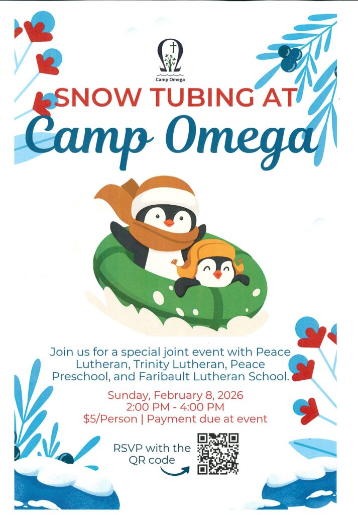 Due to the lack of snow, the snow tubing event scheduled for January 11 has been rescheduled for Sunday, February 8 from 2-4 p.m. Please sign up at the information desk or use the QR code. There is a cost of $5 per person whether you snow tube or not. All of Trinity, Peace, FLS and Peace Preschool are invited. This is an opportunity to become acquainted with our fellow Christians in a fun environment.